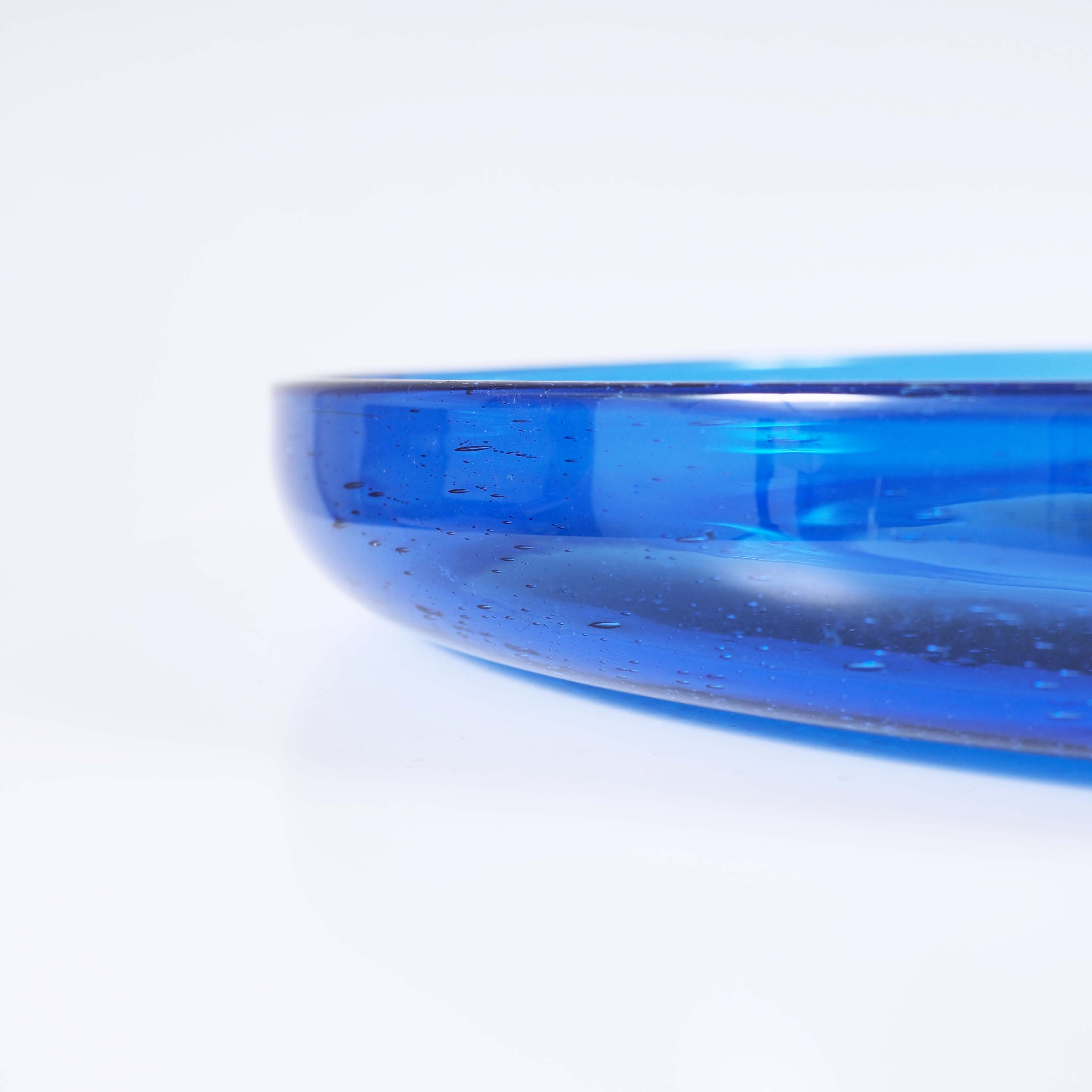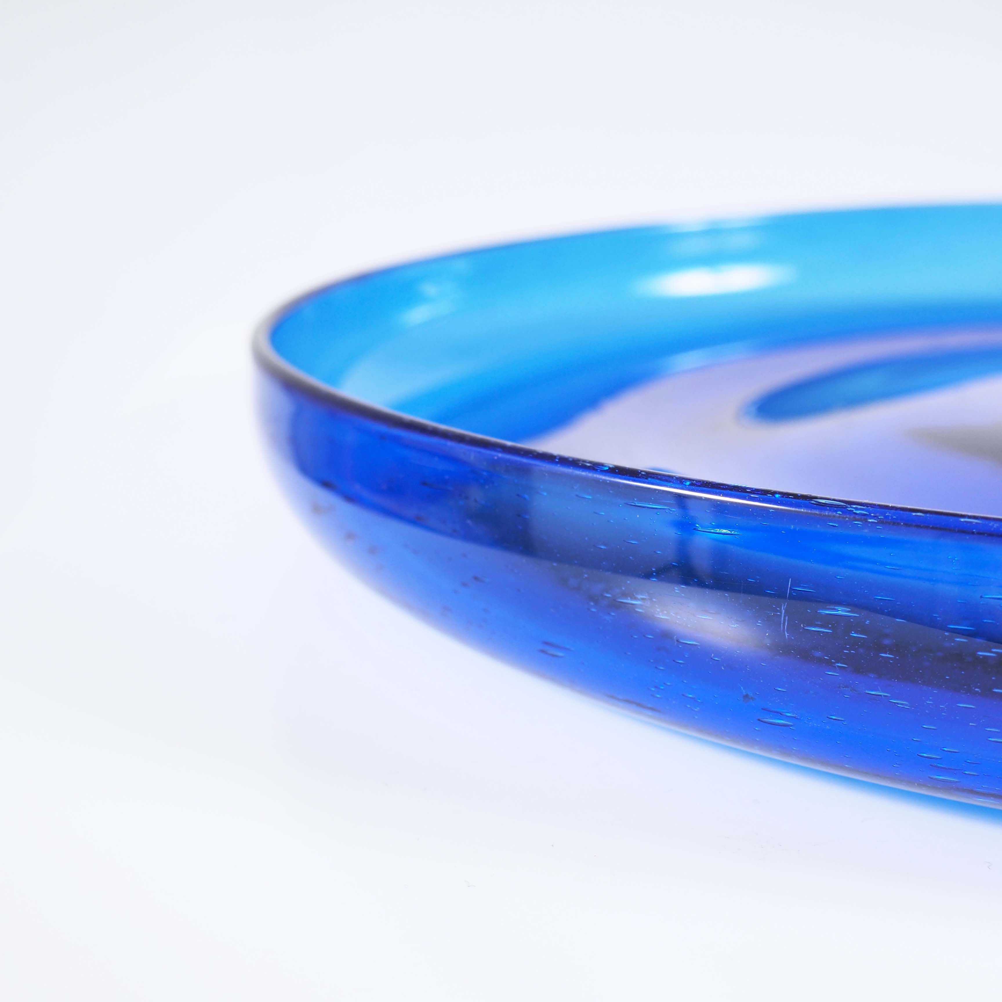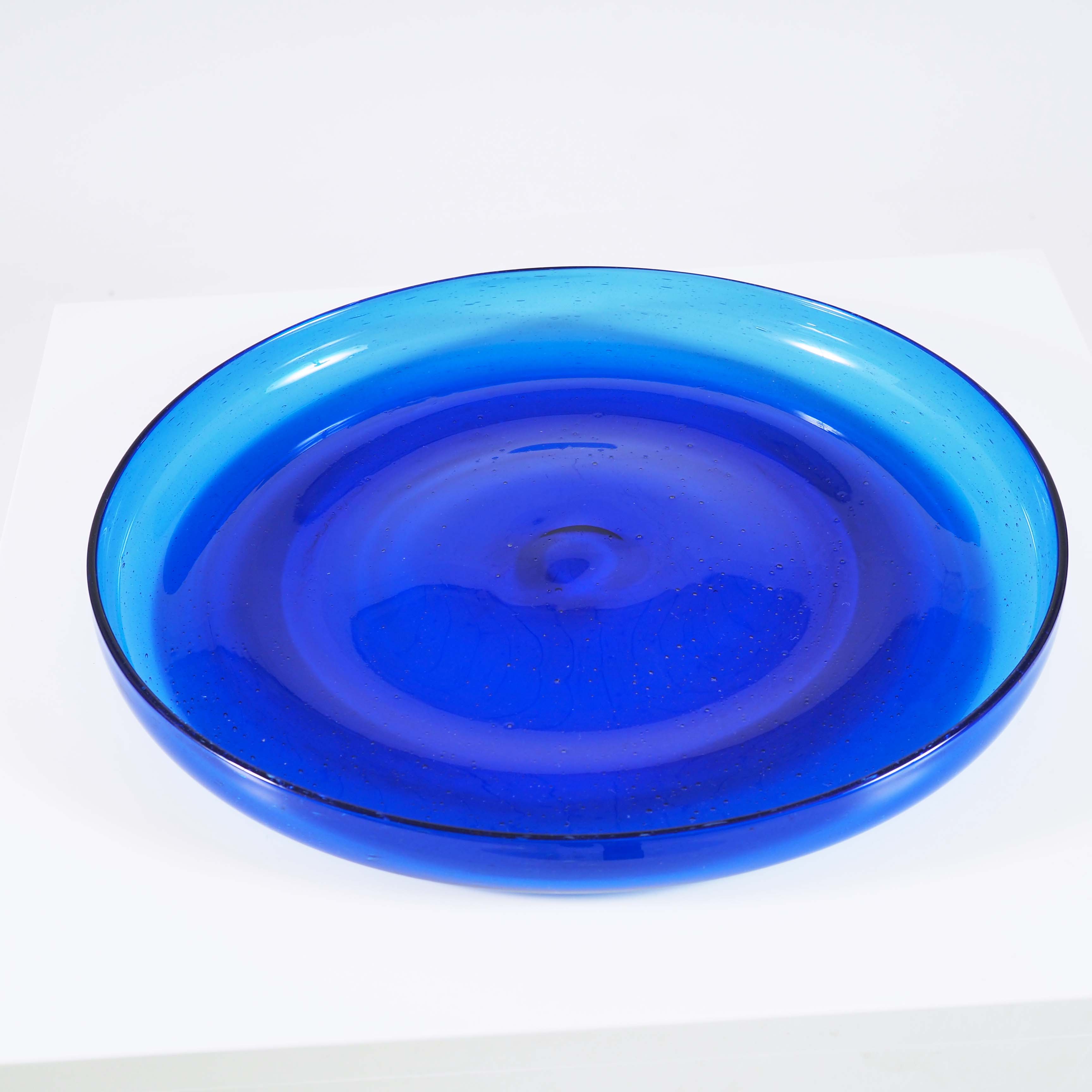 Large hand blown glass tray by Erik Höglund, made at Boda glassworks. The tray is typical for Höglund's rustic style, with irregular bubbles in the glass. Höglund was bored by the perfection of the 1950s and experimented with different ways to make the glass more vivid.
