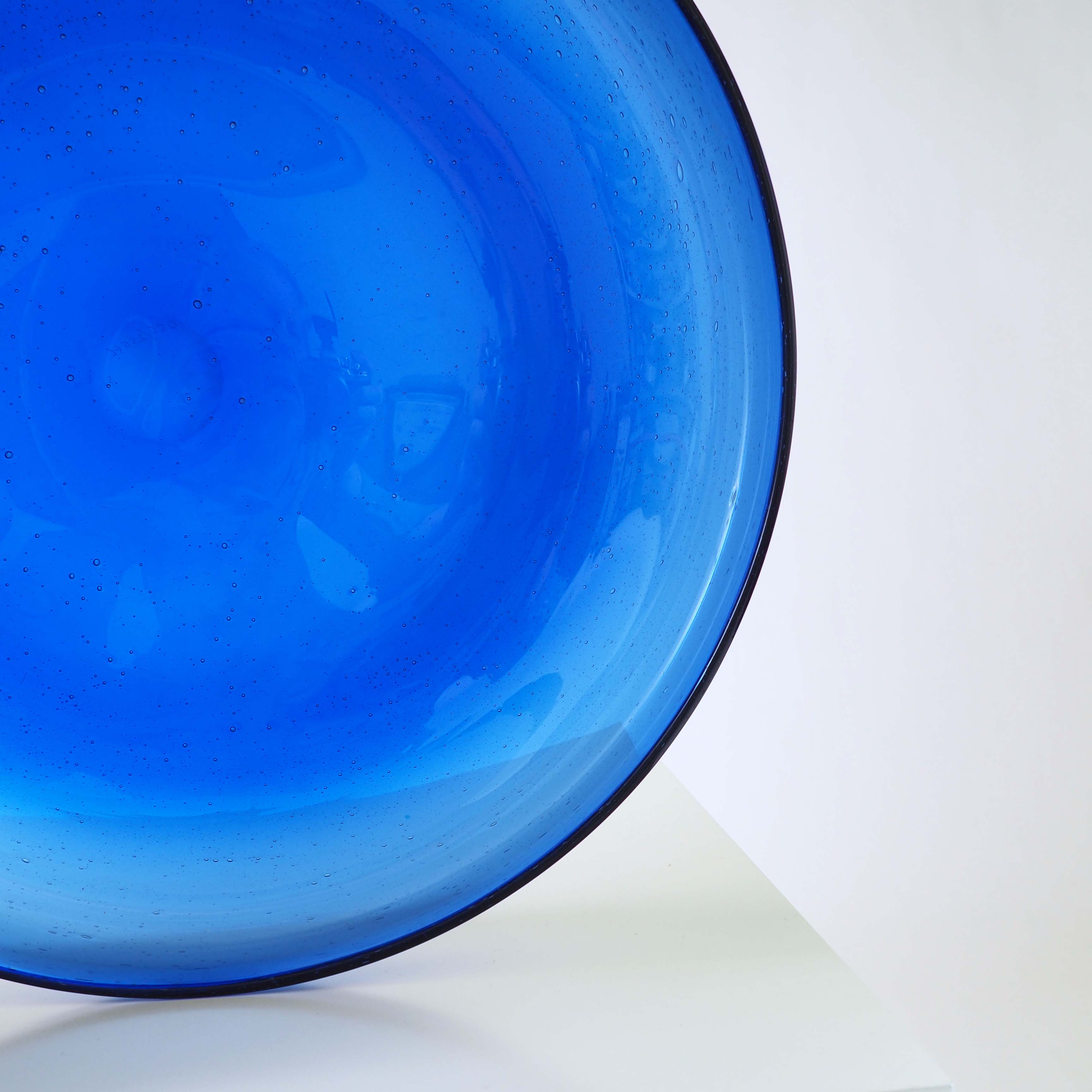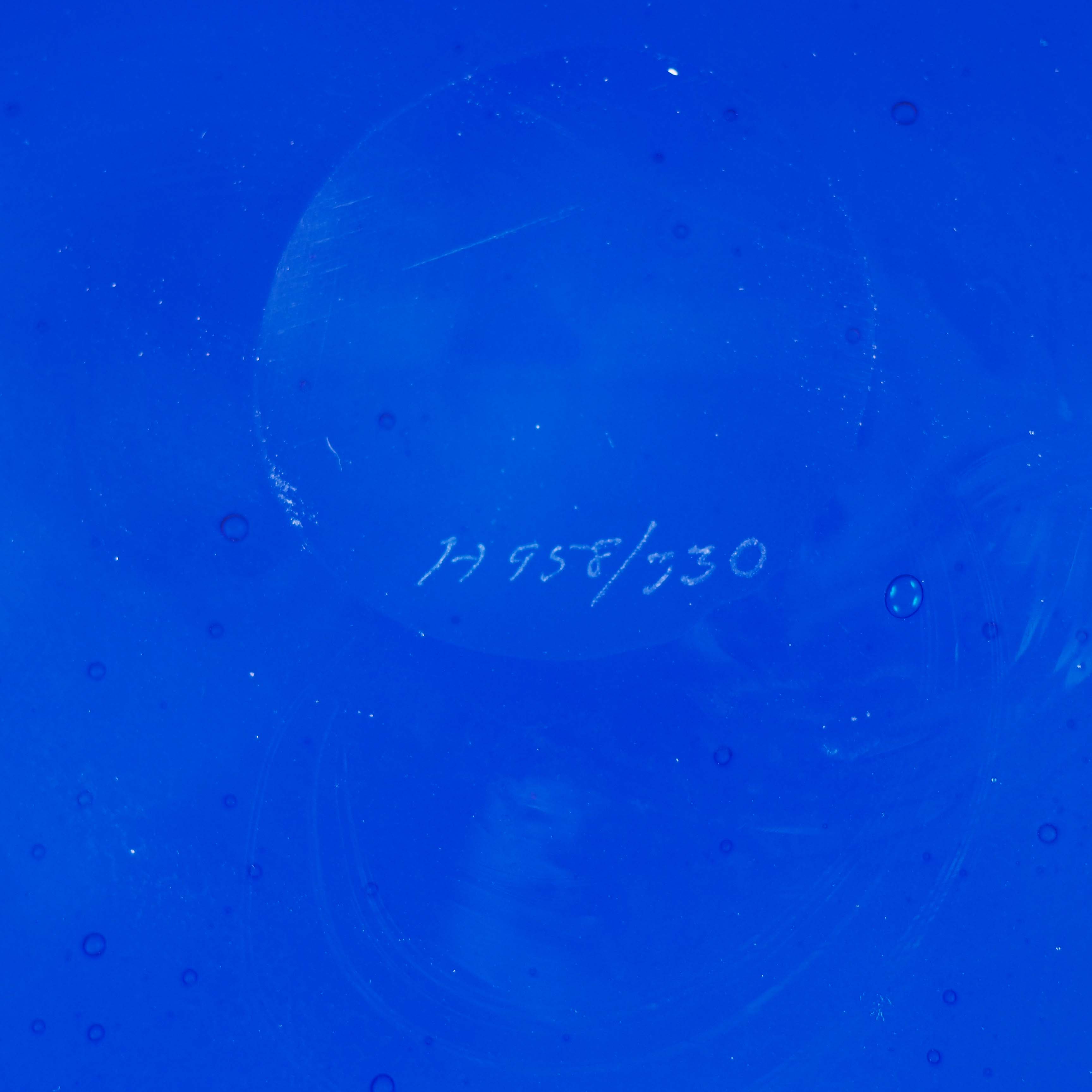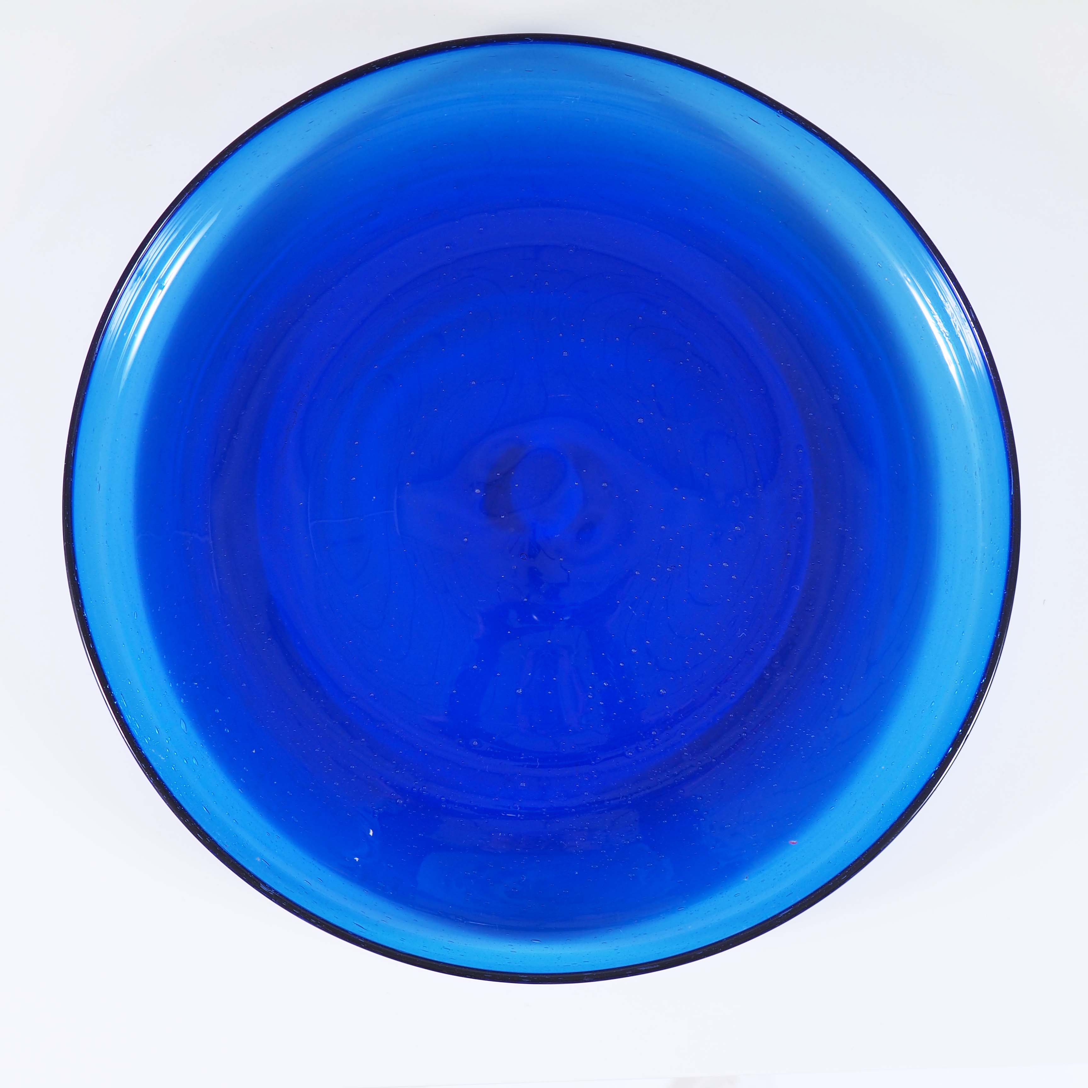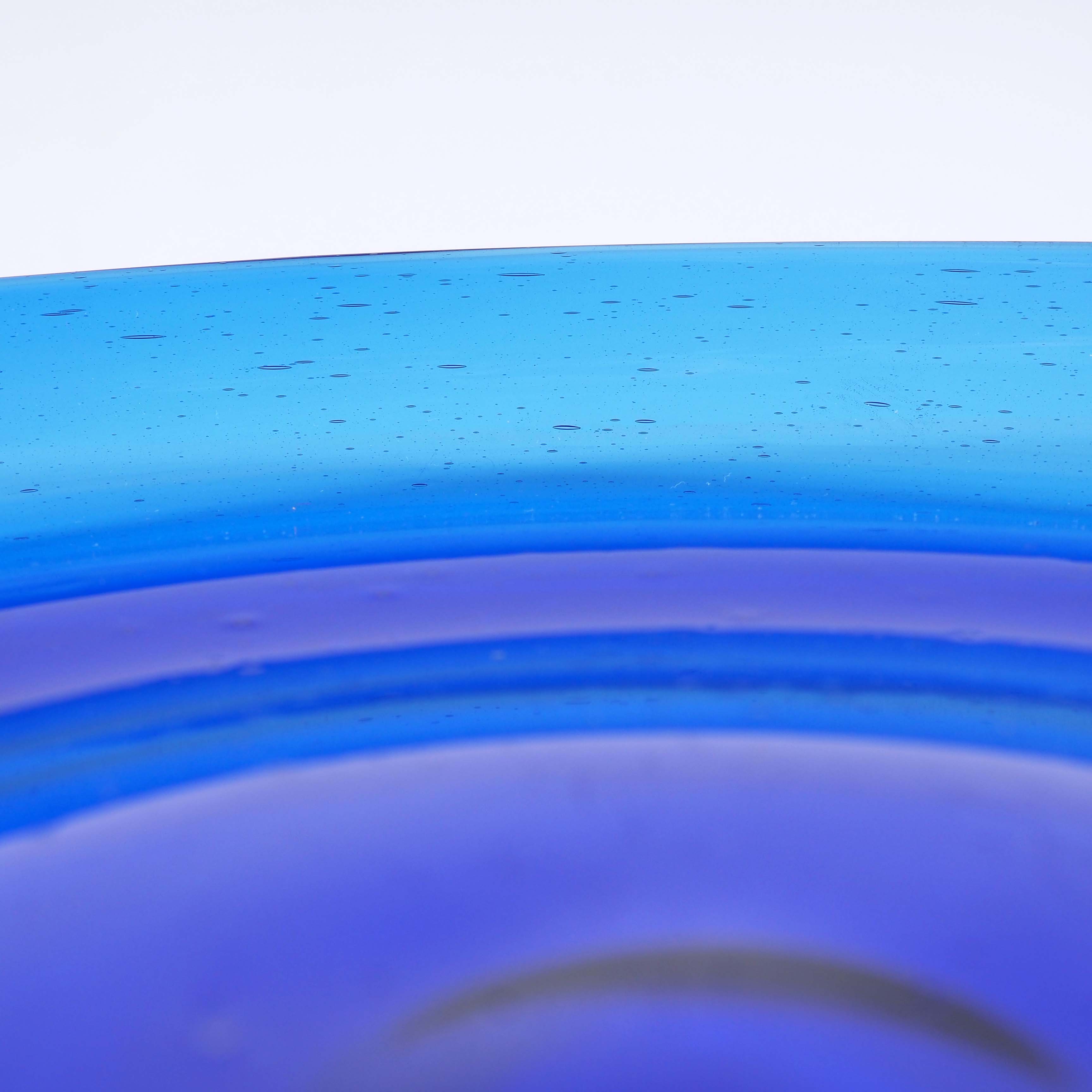 Large hand blown glass tray by Erik Höglund, made at Boda glassworks. The tray is typical for Höglund's rustic style, with irregular bubbles in the glass. Höglund was bored by the perfection of the 1950s and experimented with different ways to make the glass more vivid.