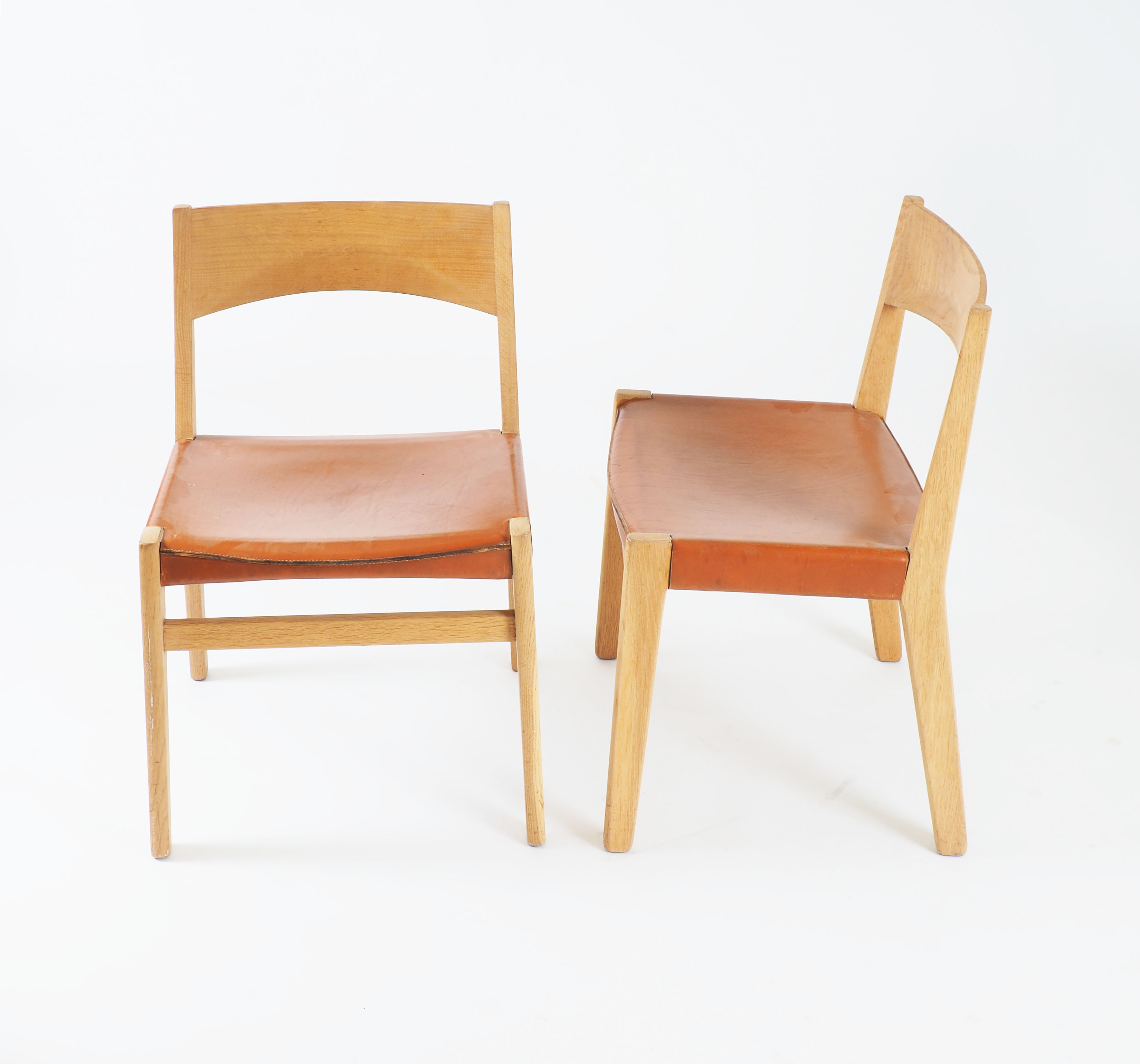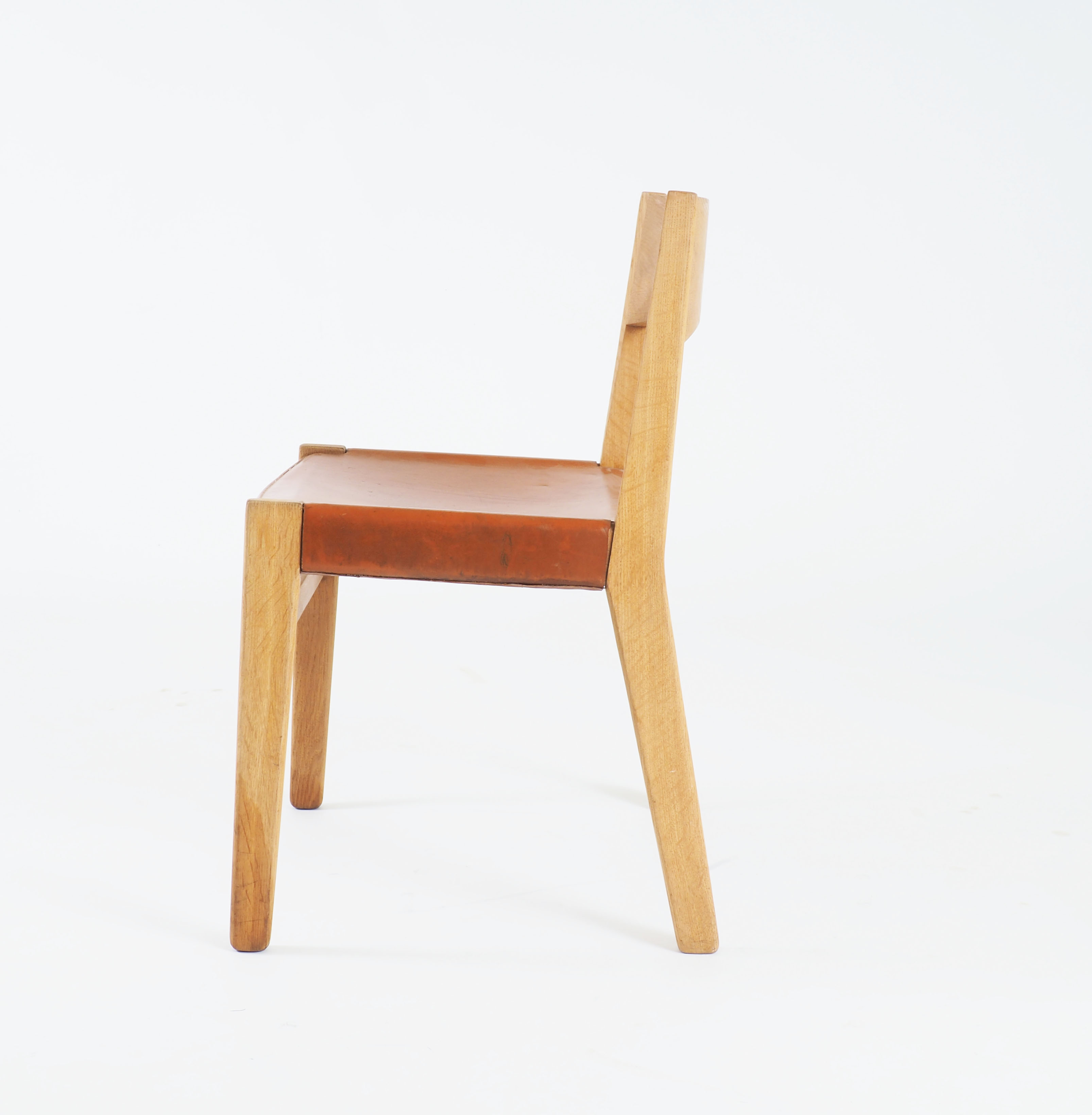 4 dining chairs in solid oak and natural leather. Designed by the Danish designer John Vedel-Rieper. Made by Köllemo, Sweden, 1960´s.