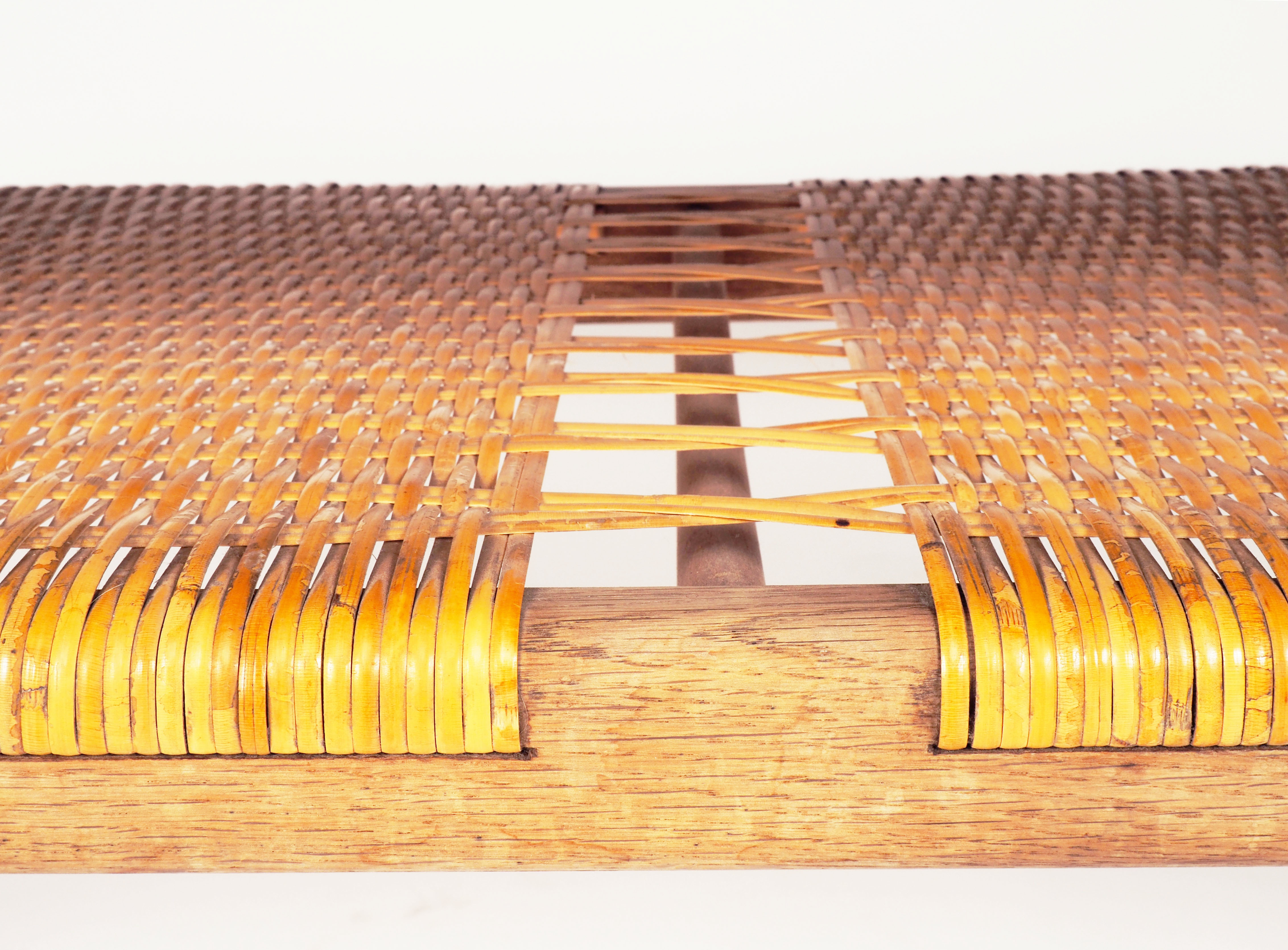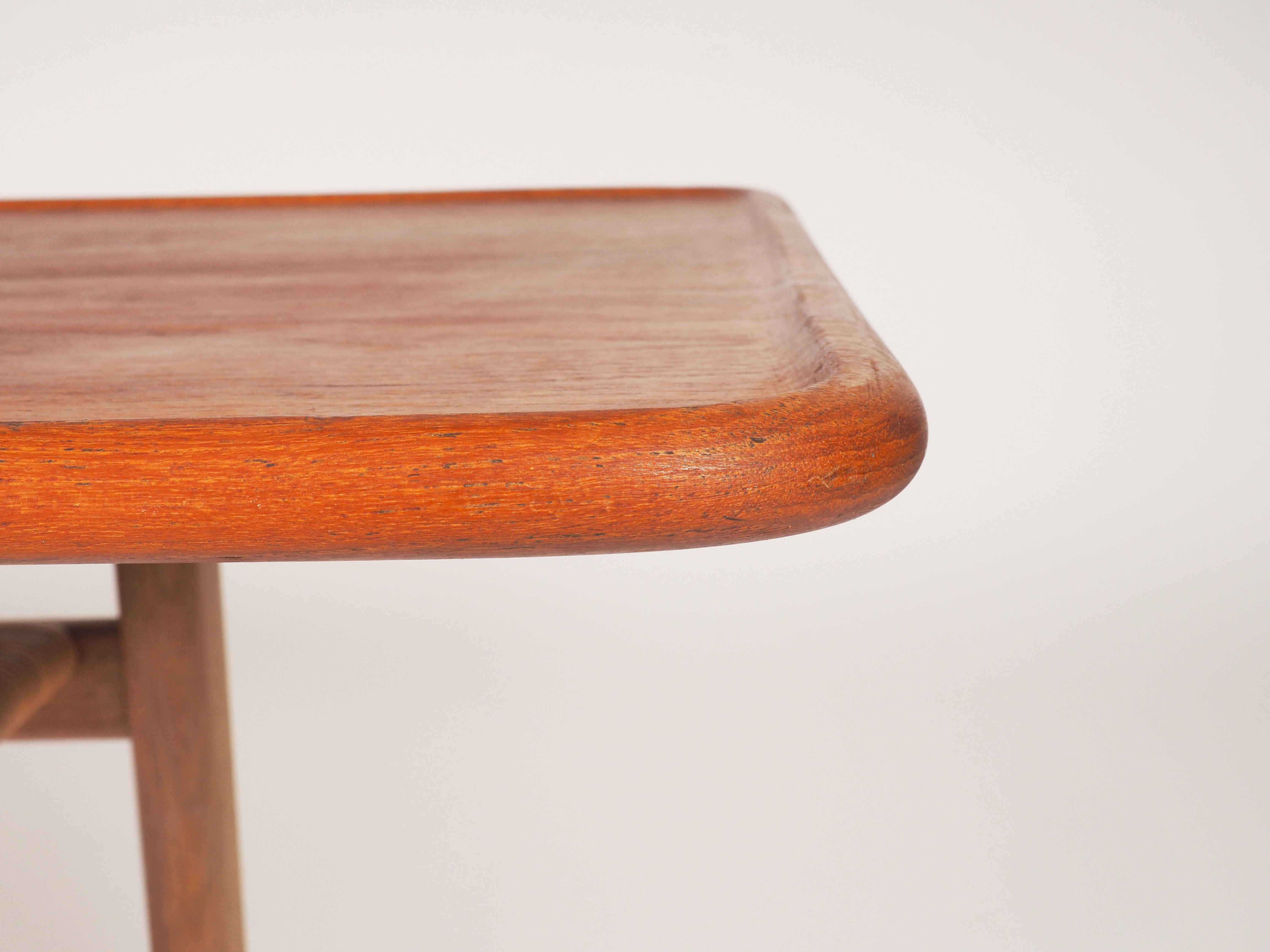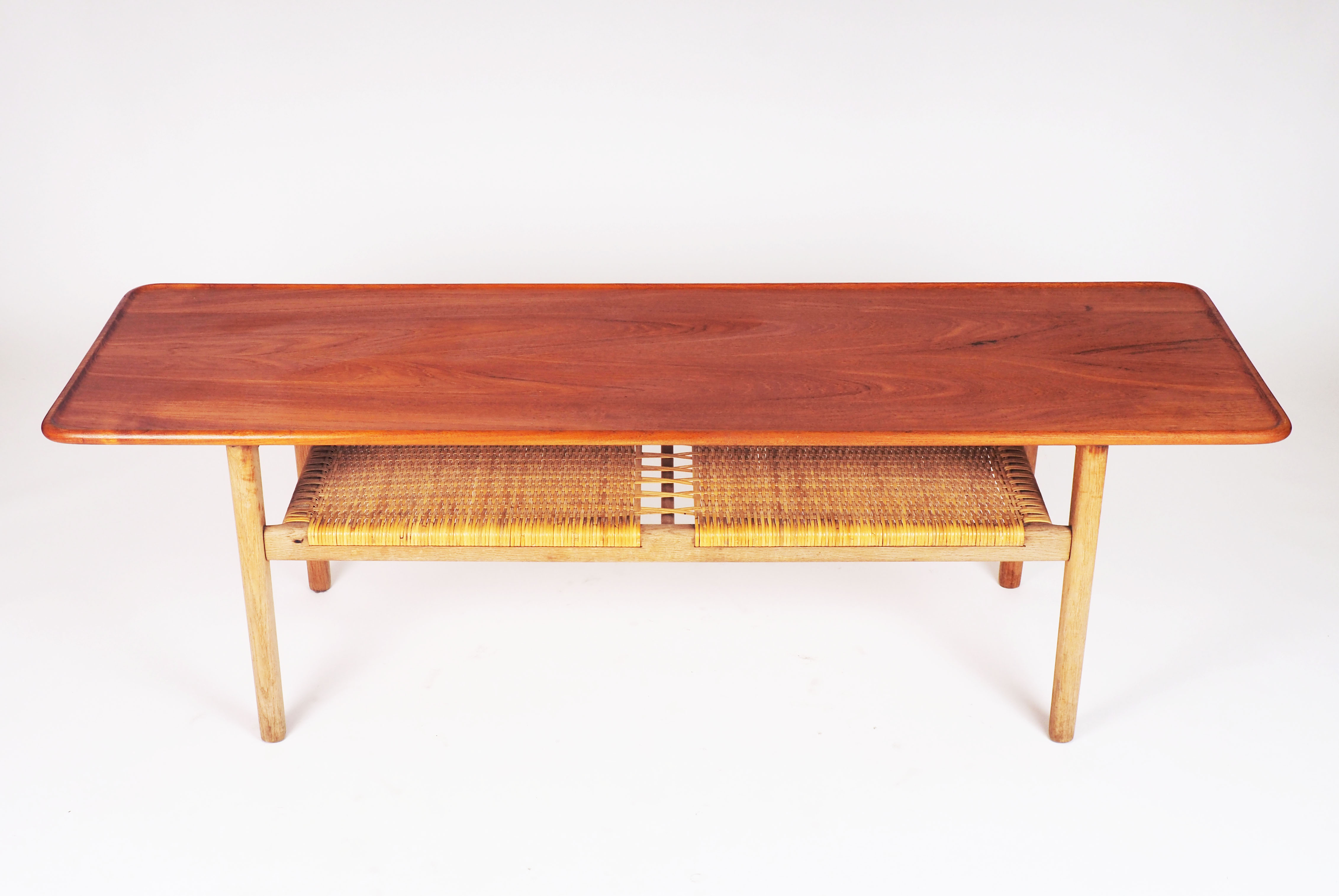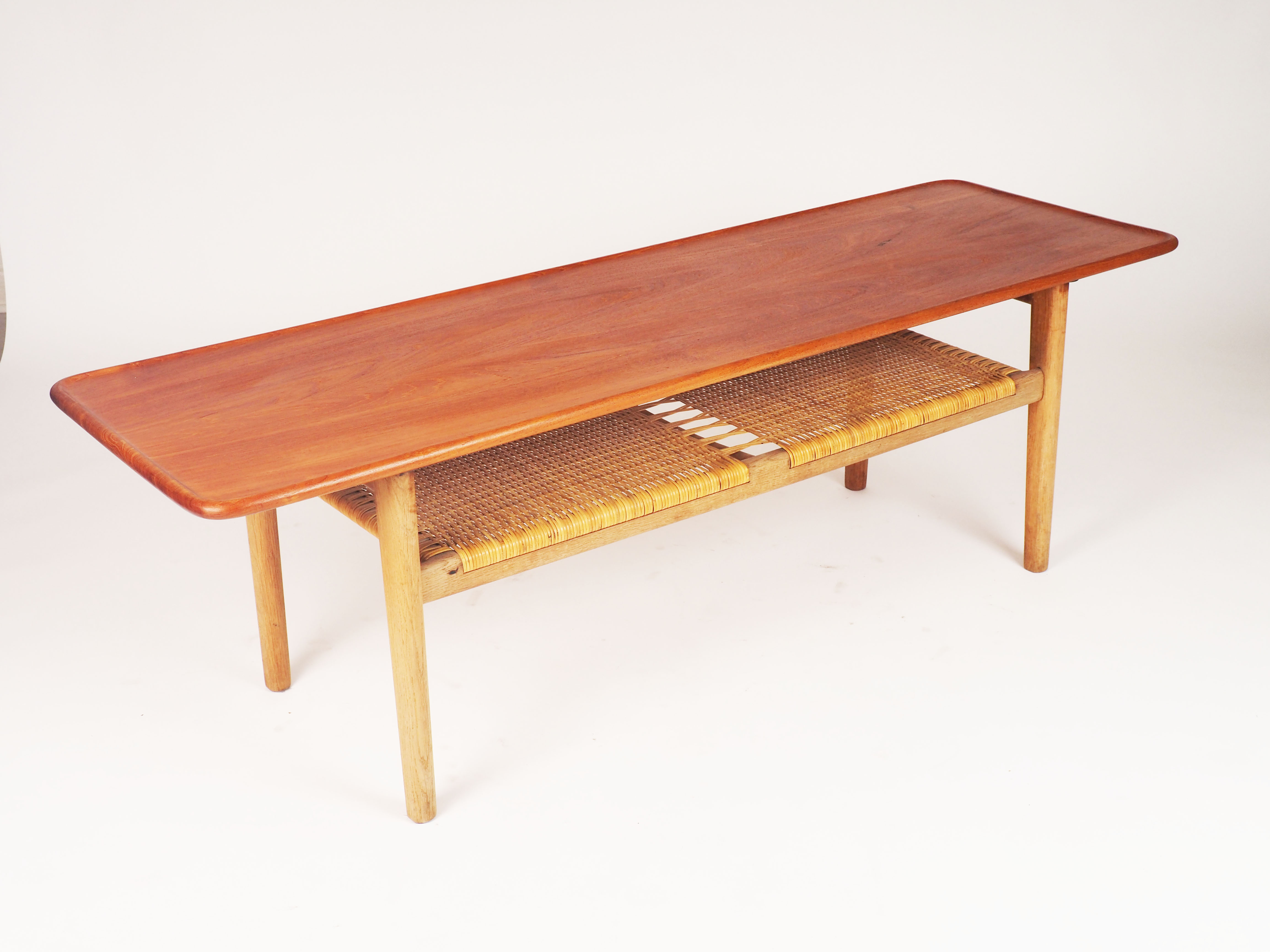 Coffee table AT-10 by Hans J Wegner. Produced by Andreas Tuck. Made with tabletop in solid teak and legs in solid oak. Beautiful shelf of hand-crafted cane.